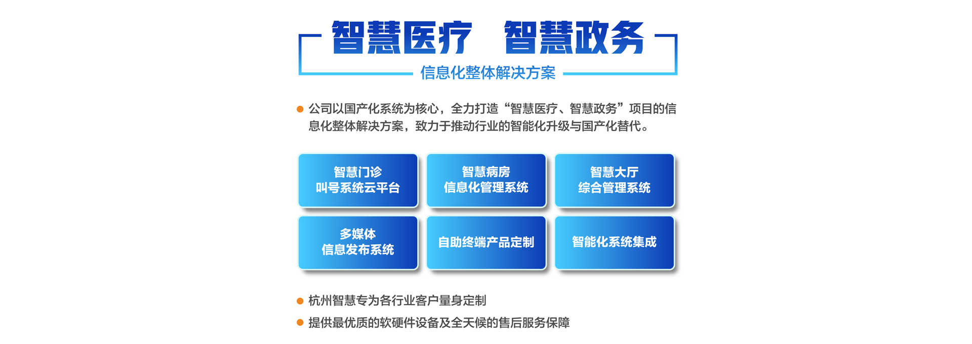 杭州智慧科技有限公司初創于2003年,總部位于重要的電子商務中心中國杭州公司主營業務有:智慧分診叫號系統、智慧病房醫護對講系統、智慧大廳綜合管理系統、智慧政務管理系統、智慧多媒體信息發布系統、導診系統及各自助終端產品定制。專為各行業客戶量身定制。公司已有20余年行業經驗沉淀積累,擁有優秀的產品外觀設計師和各類中高級專業技術工程師,確保所研發的產品具有行業領先的外觀及可靠的技術性能。并擁有權威部門頒發的各類知識產權及專利證書,30多項資質證書、800多個合作伙伴、2000多個項目成功案例經驗。 智慧產品已遍及全國各醫療、政務、金融、通訊、公安、工商、稅務等行業,形成以“立足杭州、輻射長三角、拓展全國”的戰略發展格局,產品經過歷年不斷創新,形成專業化、平臺化,致力于成為智慧產品的領軍企業。 公司建立了完善的技術培訓及售后服務中心,并設24小時熱線咨詢電話解答用戶反饋的問題。同時應客戶要求定期派技術人員到 全國各地進行技術指導輔助用戶正確使用智慧產品并能獨立安裝、調試、日常維護等工作。提供最優質的設備及全天候的售后服務保障,智慧永恒不變的服務宗旨——致力于客戶的滿意與成功!...
